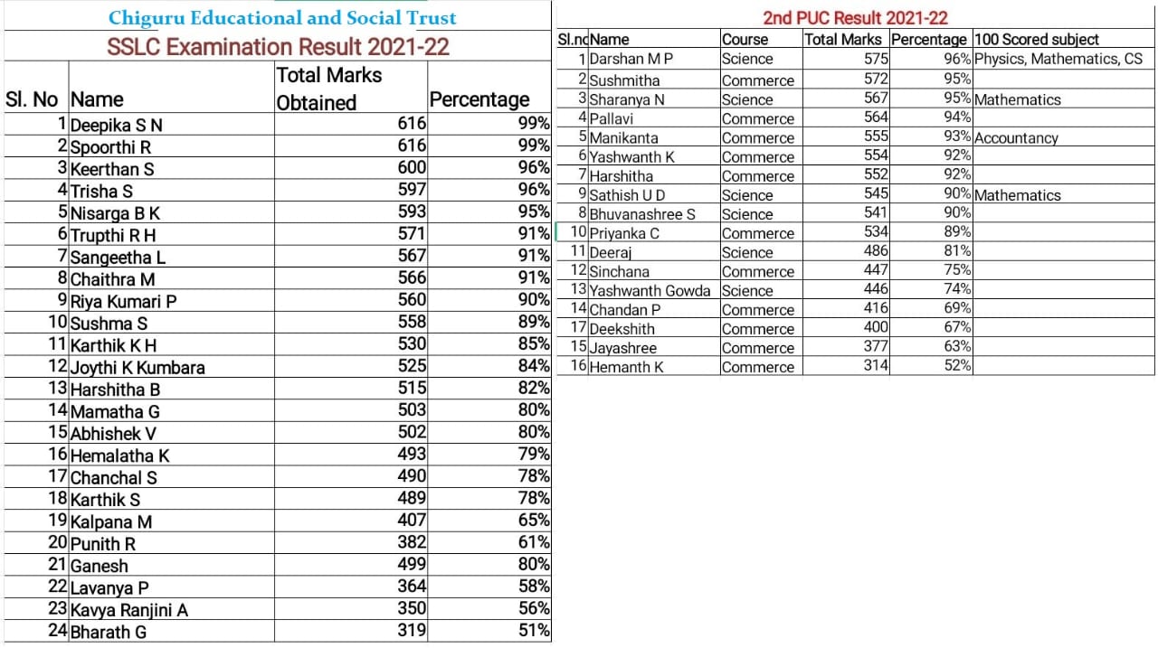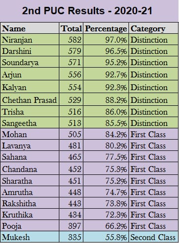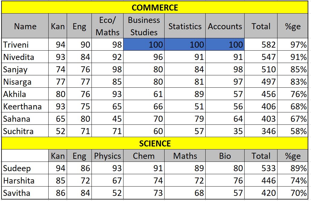 PUC - Out of 17 students supported by the Trust - 9 students have scored 90% or more, With Darshan M.P. scoring 100, 100, 100 and 99 in core subjects and 3 other students scoring 100 in at-least in one subject.