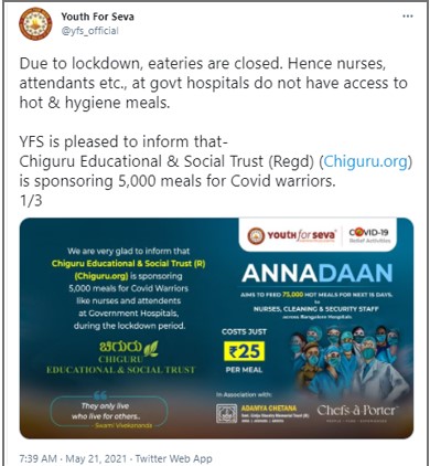 Youth For Seva, a NGO in association with Adamya Chethana provided free meals to hospital staff during the lockdown period. Due to lockdown, eateries are closed. Hence nurses, attendants etc., at govt hospitals do not have access